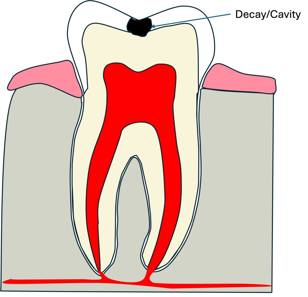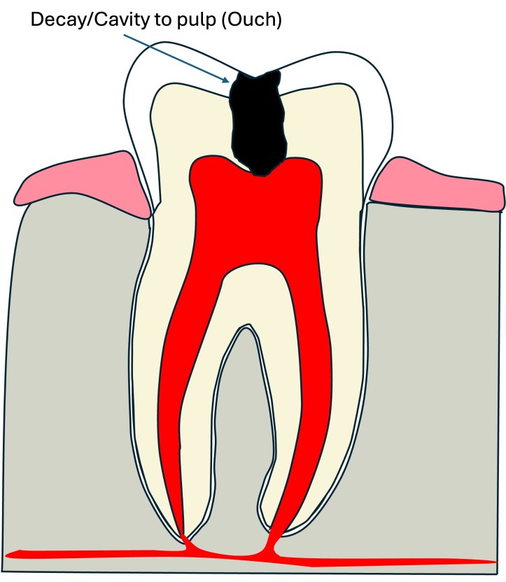 The mouth is full of bacteria (yuck). But don’t worry – some are very good bacteria, others are bad. Many of them have a favorite food: sugar (yum). And they produce acid (ugh). So when there are lots of sugars for the bacteria to munch on, they produce lots of acid. This slowly dissolves some of the tooth structure, or in fancy terms: decalcification (dee-cal-sih-fih-cay-shen). If enough of the tooth structure gets dissolved, it can lead to a hole. If the decay gets really deep, it can reach the pulp, or “nerve”, inside the tooth causing pain and possibly an infection.
